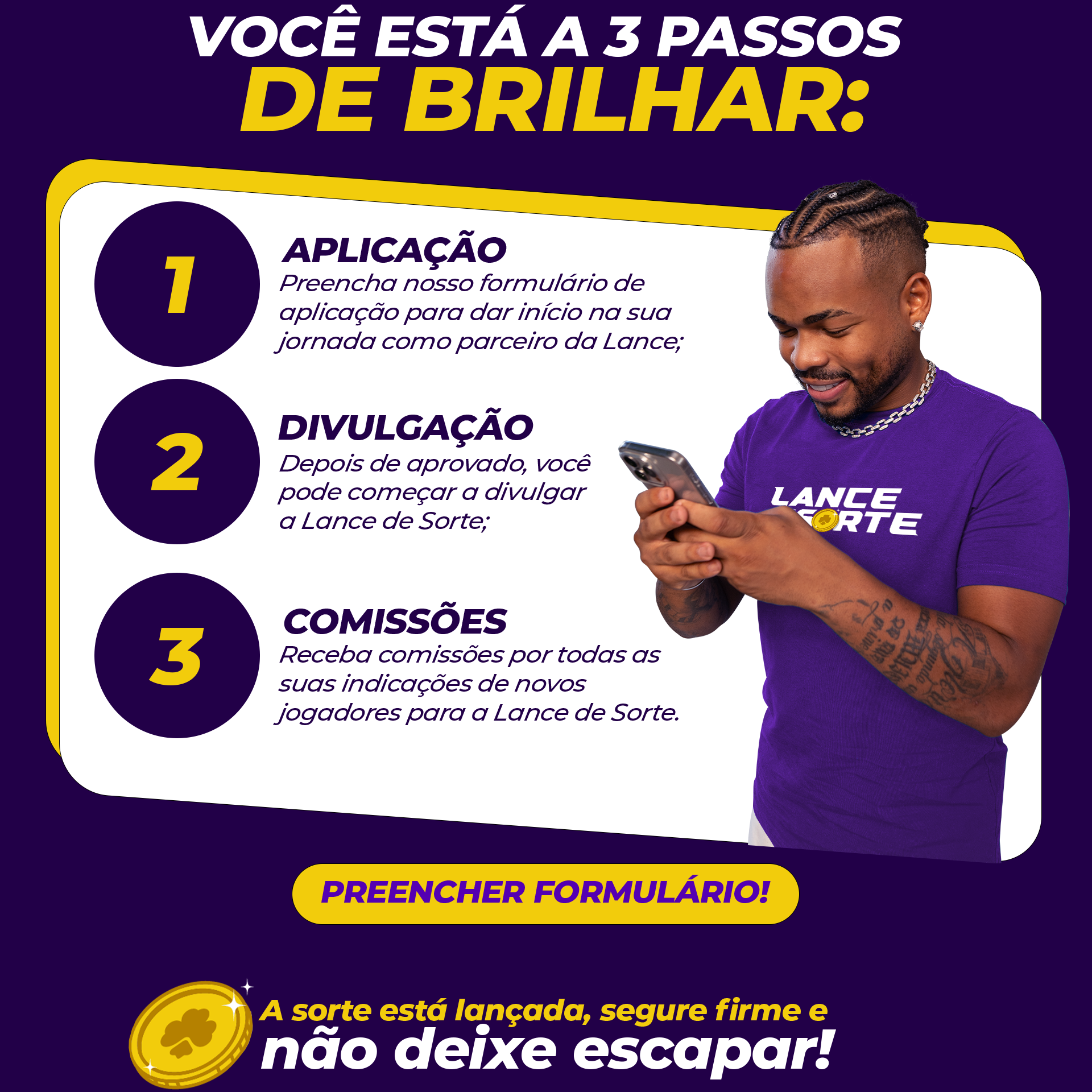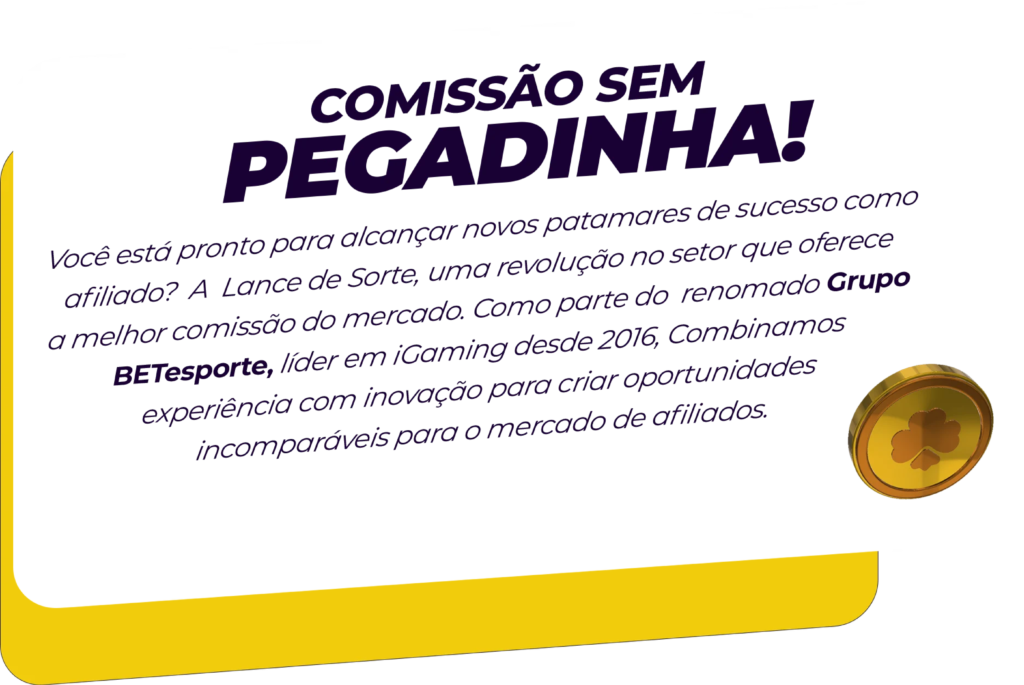 Porque oferecemos uma combinação única de benefícios que não só impulsionarão seus ganhos, mas também ampliarão sua influência no setor. Nosso programa não se trata apenas de números, mas de parceria estratégica de longo prazo para perfis que iremos selecionar , aos quais ofereceremos suporte dedicado para maximizar seu sucesso, acesso exclusivo a insights de mercado e campanhas promocionais inovadoras que garantem altas taxas de conversão. Além disso, valorizamos a transparência e a confiança, garantindo que você seja recompensado de forma justa e pontual. Junte-se a nós e faça parte da Liga de Afiliados da Lance de Sorte para uma jornada onde seu potencial de ganhos é ilimitado e sua voz é ouvida de verdade por pessoas como Você.